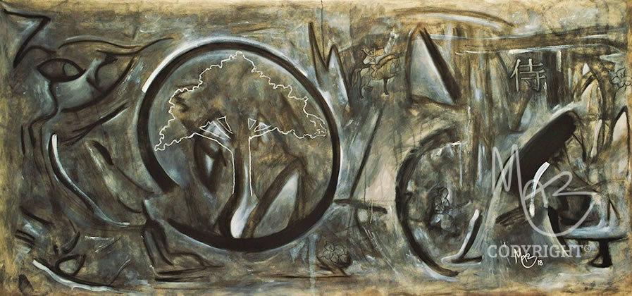 El trabajo consiste en: un Ensō (円 相), un cerezo, flores de cerezo, el primer Samurai a caballo, Samurai y el kanji de la palabra Samurai. El antiguo código de ética del Guerrero en Japón, el ideal del Samurai era vivir con pasión o «vivir con belleza», es decir, vivir con sinceridad y belleza interior, incluso si la vida fuera corta. La caída de los pétalos del cerezo (Sakura) representa la transitoriedad de la vida y la belleza de la naturaleza. Pero el florecimiento de Sakura tiene un significado más profundo: el comienzo de una nueva vida.