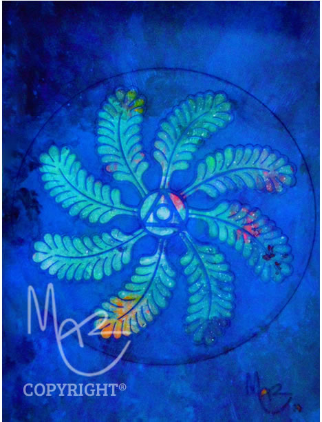 Esta obra elaborada en acrílico sobre lienzo y gemas, es el resultado de un apasionante viaje en la búsqueda del interior del arte inspirado en la naturaleza y sus formas de la artista francesa Sèraphine Louis, perteneciente a los pintores “naifs” o también llamados “pintores del Sagrado Corazón”; quien manifestaba que comenzó a pintar por indicación de los ángeles y la virgen. Este cuadro busca a través de su centro realizar una búsqueda espiritual armónica mediante la calma. En este centro nos espera la fuerza y la energía, así como el equilibrio, el silencio y la serenidad.